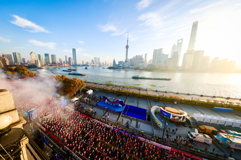 2025年11月30日,2025上海马拉松在外滩金牛广场鸣枪起跑。这是顶楼视角的2025上海马拉松起跑仪式现场。