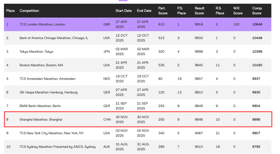 世界田联的这份排行榜,基于“赛事表现积分体系”,主要由参与分和成绩分构成:前者看精英选手阵容的深度与广度,后者看选手成绩在当季全球水平中的位次,是衡量一项马拉松赛事竞技含金量的重要标尺。