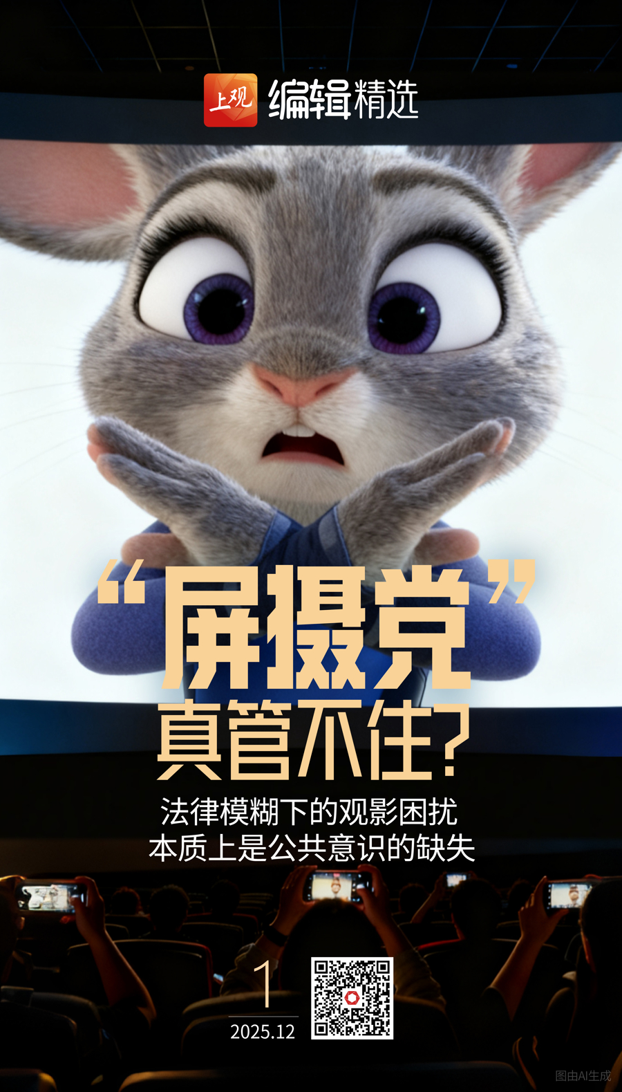 归根结底,多数情况下,影院屏摄更多是公共意识与社会共识的问题,既需要法律进一步完善,也需要片方、影院、演员、观众等多方共同努力,形成引导观众的合力。《疯狂动物城2》等电影引发的每一场争论,无论能否得出结论,都是一次推动问题向着解决方向更进一步的机会。