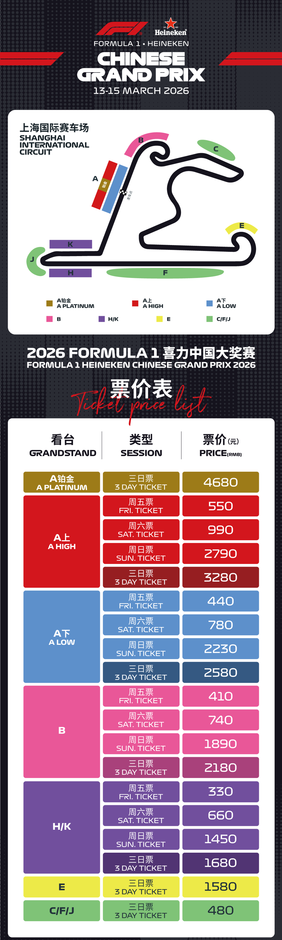 此外,在购买(A上、A下、B、H/K)看台的周五、周六单日票时,还可使用“乐动上海”体育消费券(观赛类)进行抵扣,再享多重优惠。而人气颇高的C/F/J草地看台则依旧保持了三天480元的亲民价格,继续稳坐车迷心中的性价比之王。