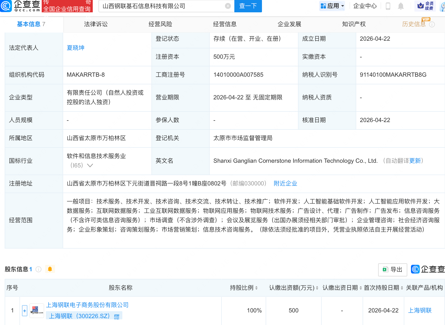 近日,山西钢联基石信息科技有限公司成立,经营范围包含:人工智能基础软件开发;人工智能应用软件开发;大数据服务;互联网数据服务等。企查查股权穿透显示,该公司由上海钢联(300226)全资持股。